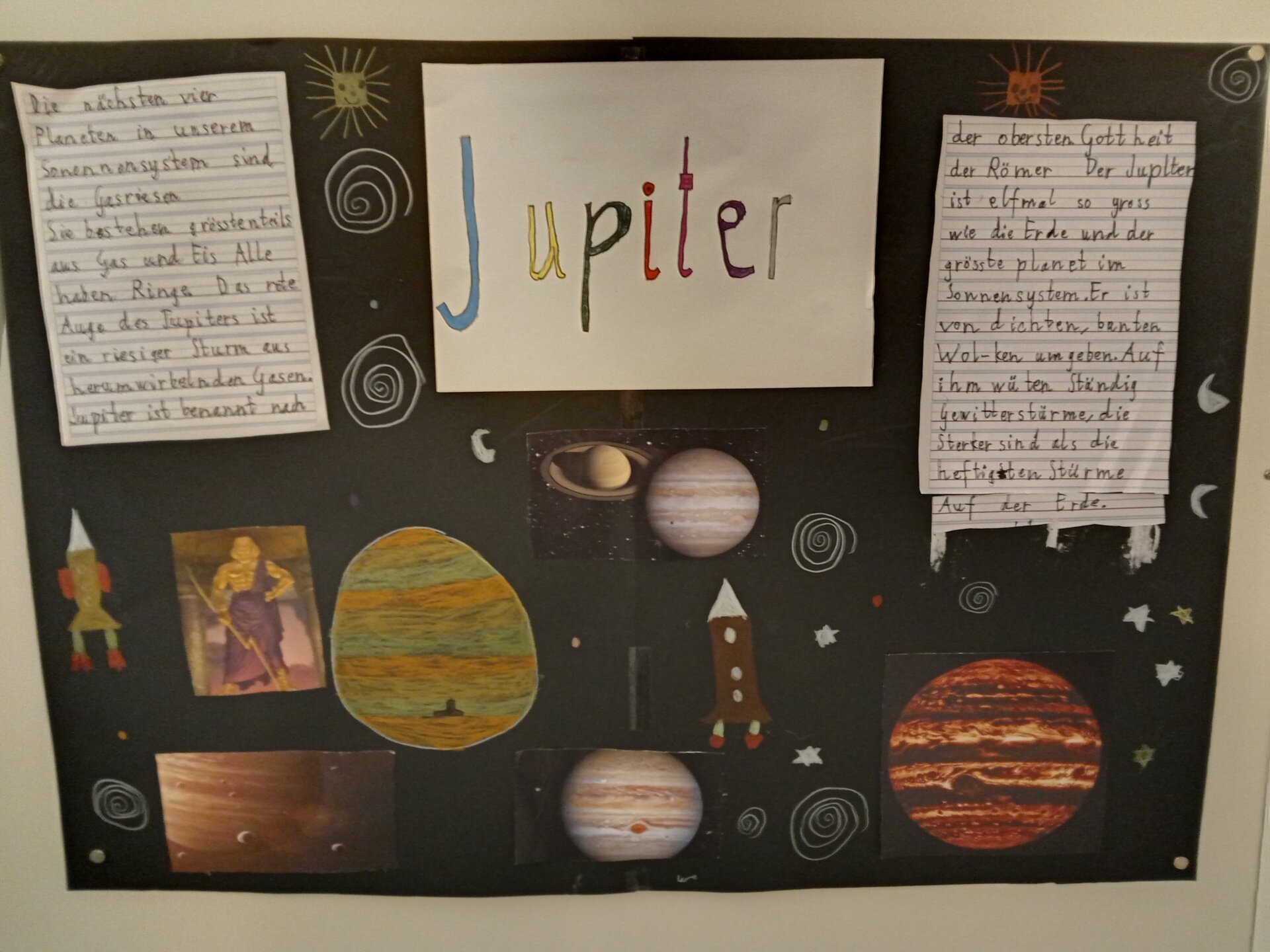 Zu ihrem Planeten erarbeitet sie über mehrere Wochen ein Plakat. Dazu mussten sie zunächst geeignete und für sie interessante Sätze mit dem Leuchtstift markieren. Anschliessend mussten sie diese sauber abschreiben. In einem zweiten Teil durften die Kinder im Internet nach geeigneten Bilder suchen, diese ausdrucken und zuschneiden. Den Titel mussten die Kinder in «fetter» Schrift schreiben, was nicht ganz einfach war, aber einen guten Effekt gibt. Zum Schluss mussten die Bilder, die Texte und der Titel auf dem Plakat arrangiert und aufgeklebt werden.